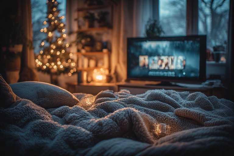 Mulailah dengan mematikan lampu plafon atau meredupkannya, lalu nyalakan lampu meja kecil dengan bohlam warm white atau string light yang sudah dipasang di sekitar sofa atau dinding. Ambil plaid tebal favorit — yang berbulu halus atau fleece lembut — bungkus di tubuh hingga dada, duduk nyaman dengan bantal di belakang punggung, dan siapkan minuman hangat di meja samping. Putar serial favorit dengan volume sedang — episode ringan yang tidak terlalu intens agar pikiran tetap rileks. Banyak yang menikmati momen ini sebagai transisi malam: cahaya redup menciptakan bayangan halus di ruangan, plaid memberikan rasa aman dan hangat, dan serial membawa senyuman kecil tanpa membuat pikiran terlalu aktif.